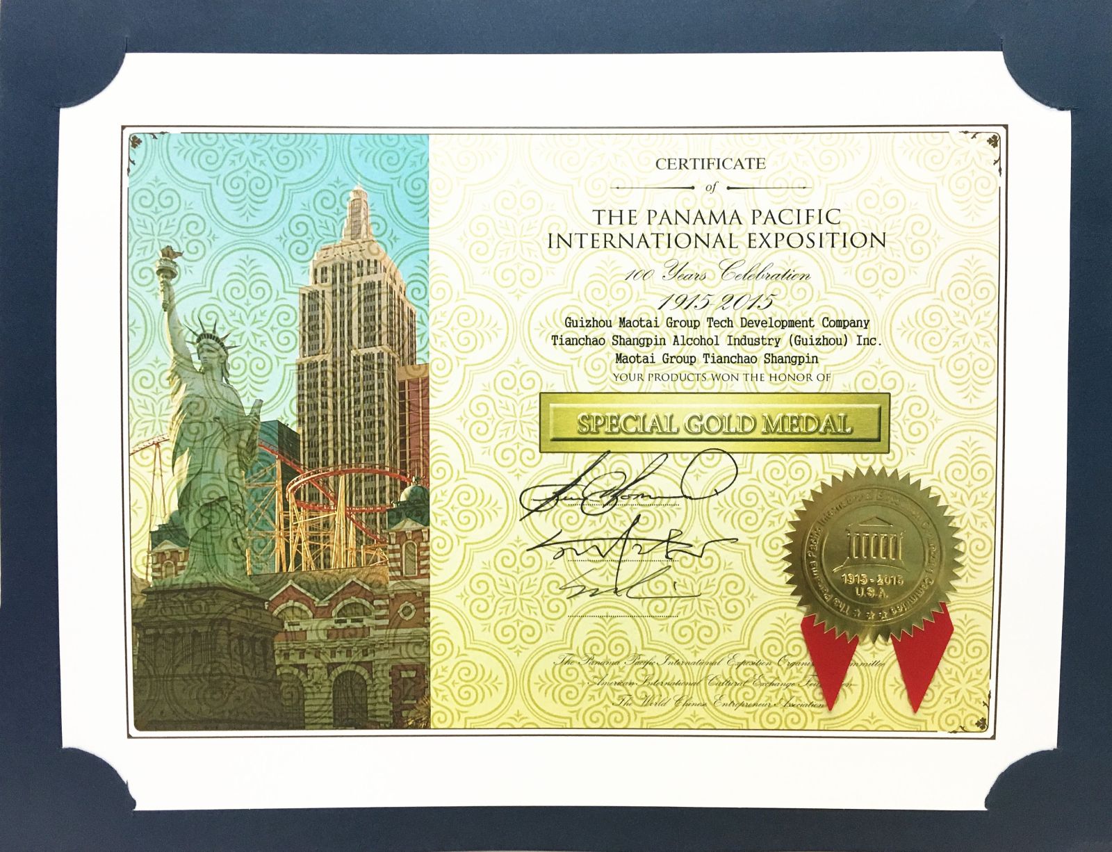 2015年12月23日天朝上品榮獲巴拿馬太平洋萬國博覽會(美國)百年慶典精品回顧展特等金獎