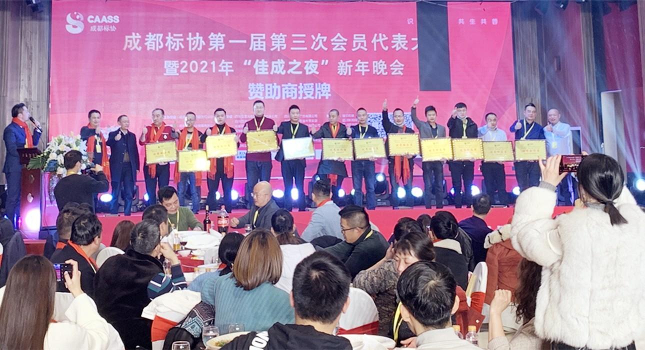 2021年1月9日,成都廣告標識服務行業協會第一屆第三次會員代表大會暨2021年“佳成之夜”新年晚會在蓉舉行。本次活動由成都市金牛區天朝上品專賣店贊助,成都市機械行業協會、成都智能焊接裝備行業協會等230余家會員單位代表出席。在本次活動中,天朝上品成都金牛區專賣店喜獲成都標協頒發的“優秀服務商”榮譽。