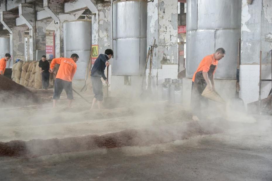▲天朝上品制酒車間工人們正在忙碌地進行下沙工序