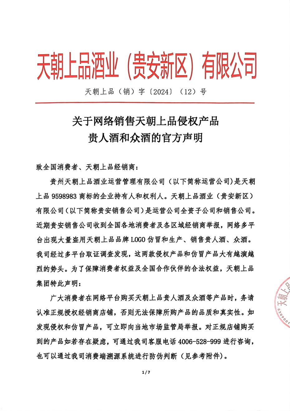 關于網絡銷售天朝上品侵權產品貴人酒和眾酒的官方聲明
