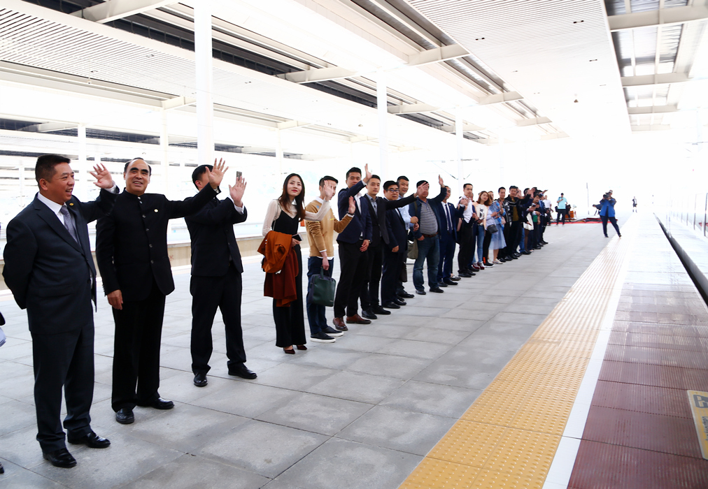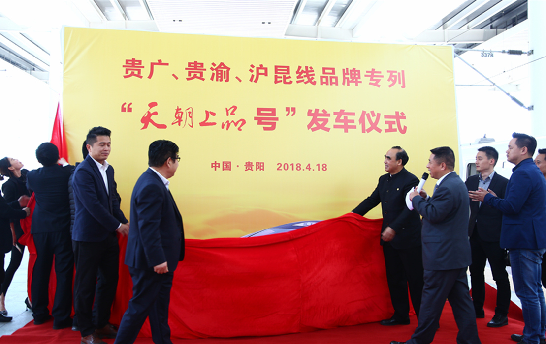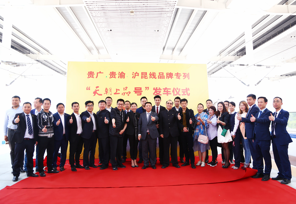 2018年4月18日,由成都鐵路局貴陽(yáng)客運(yùn)段值乘的3組貴渝、滬昆、貴廣線(xiàn)高鐵動(dòng)車(chē)組“天朝上品號(hào)”品牌專(zhuān)列首發(fā)式在貴陽(yáng)北站隆重舉行。天朝上品酒業(yè)副董事長(zhǎng)兼總裁黃永毅,副總裁江貽燦,總裁助理曾祥坤、韓萍,各大區(qū)負(fù)責(zé)人,成鐵傳媒貴州分公司總經(jīng)理丁航,貴州新黑馬傳媒董事長(zhǎng)毛婧、總經(jīng)理越飛,人人投創(chuàng)始人鄭林、聯(lián)合創(chuàng)始人王攀,北京首汽集團(tuán)旅游車(chē)公司總經(jīng)理朱樹(shù)增,以及聞?dòng)嵹s來(lái)的全國(guó)經(jīng)銷(xiāo)商代表等共同出席首發(fā)式。