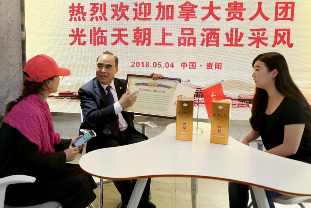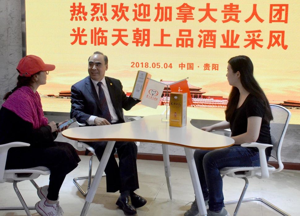 江貽燦副總裁向來賓簡要介紹了天朝上品的發展歷程和品牌文化。他強調,世界白酒看中國,中國白酒看貴州,貴州白酒看茅臺,貴州白酒的行業地位可見一斑。天朝上品作為茅臺酒廠集團技術開發公司研發的柔和醬香白酒,順應了市場發展趨勢,受到國內外消費者的熱捧。天朝上品以“給世界一瓶好酒”為愿景,堅持品類+品質+品牌的發展戰略,以酒為媒,縱橫百業,共享資源,共塑品牌,以打造大眾卓越品牌為目標,以締造世界級中國品牌為使命,面市至今榮獲160余項國內外大獎,獲得了國家和國際的共同認可。希望加拿大攝影團的貴人們與我們一起搭建起傳播貴州文化的橋梁,讓更多的外國朋友喝上柔和醬香,愛上天朝上品。