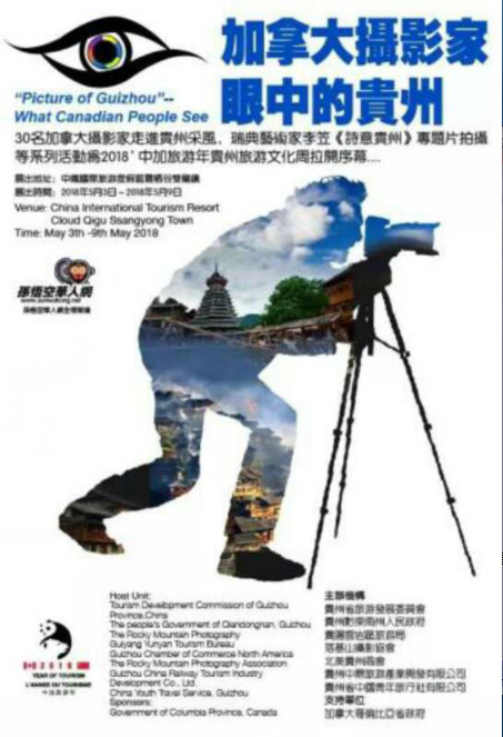 2018年是中加兩國政府確定的“中加旅游文化年”,其中“貴州旅游文化周”是中國總理李克強與加拿大總理特魯多商定的“中加兩國旅游文化年”活動之一。“加拿大攝影師眼中的貴州”攝影活動由貴州省旅游發展委員會、黔南州人民政府、北美洛基山攝影協會、北美貴州商會主辦,在加拿大哥倫比亞省政府、大溫哥華本拿比市政府的大力支持下,35名加拿大專業攝影家走進貴州采風。“2018加拿大攝影師眼中的貴州藝術展”將在加拿大溫哥華展出,為北美地區人民充分了解和認識貴州婀娜多姿、豐富多彩的自然景觀、人文風情搭建一座友誼虹橋。