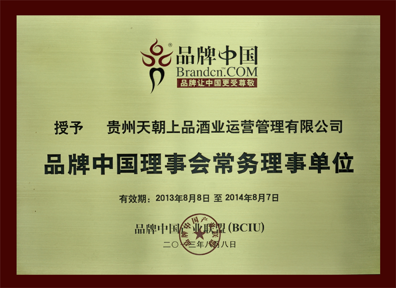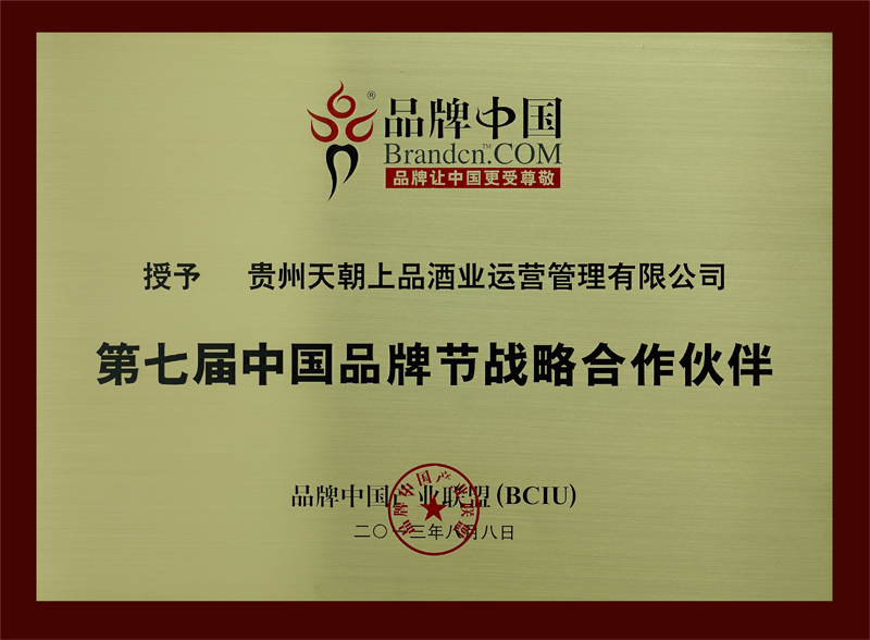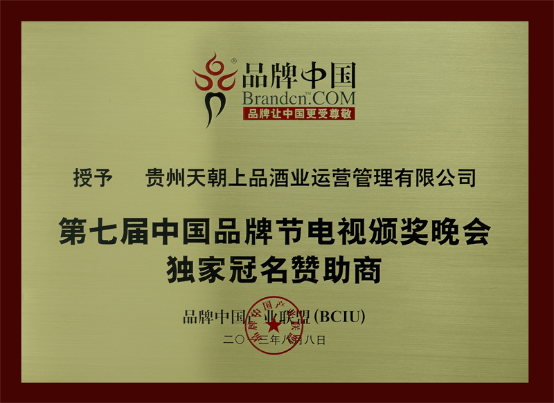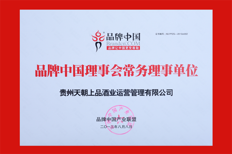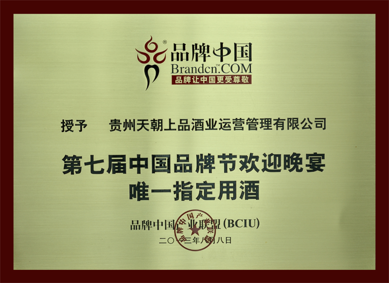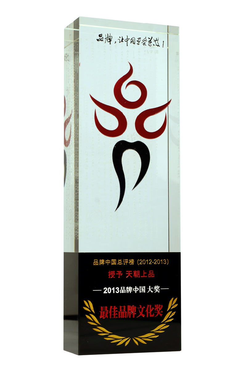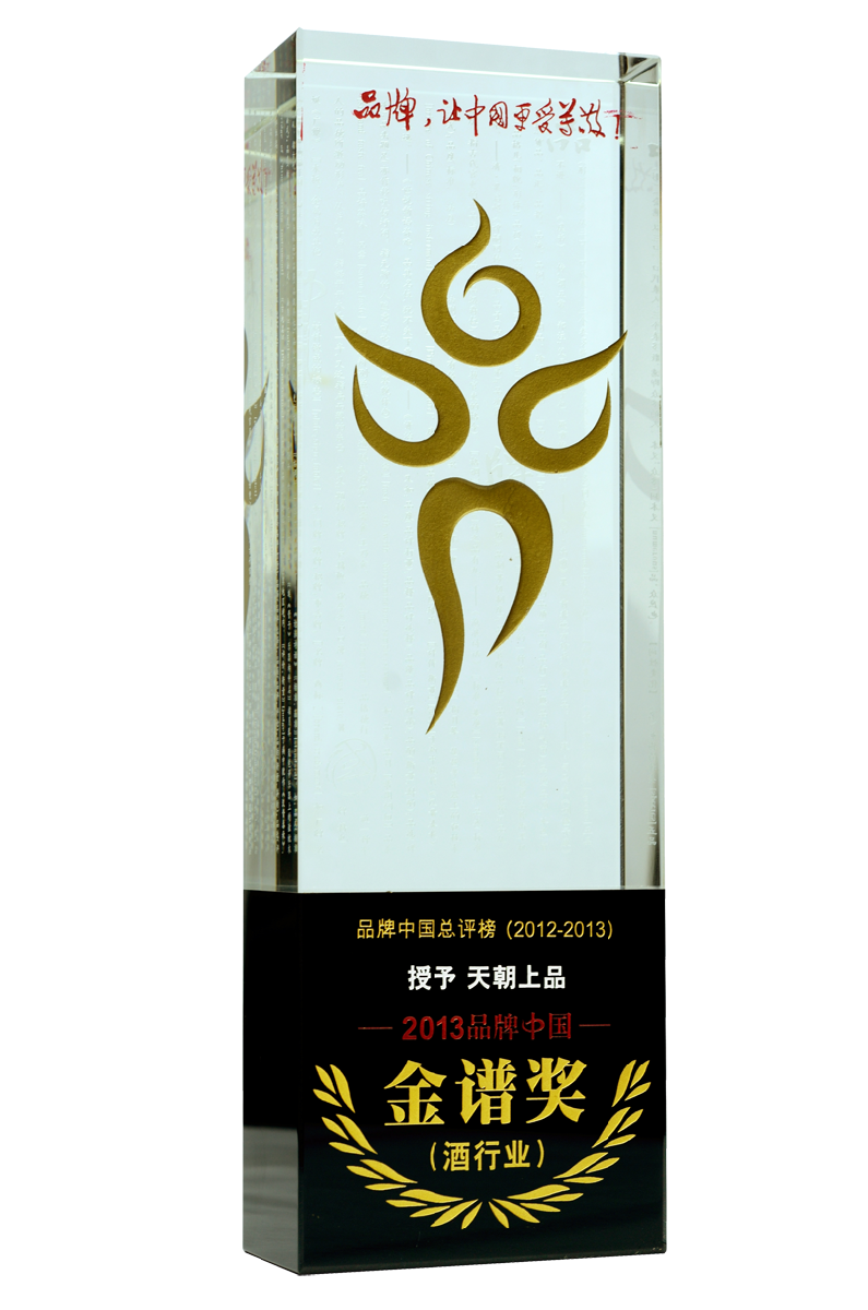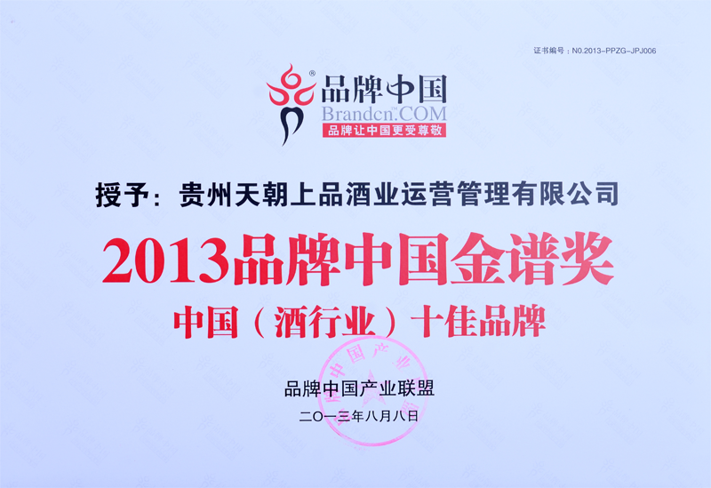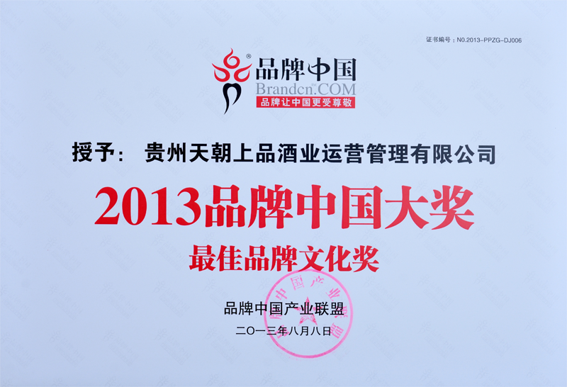 2013年8月8日—10日,天朝上品榮獲品牌中國“金譜獎”、品牌中國大獎——“最佳品牌文化獎”,獲“第七屆中國品牌節戰略合作伙伴”、“第七屆中國品牌節唯一指定用酒”、“品牌中國產業聯盟理事單位”、“第七屆中國品牌節電視頒獎晚會獨家冠名贊助商”等榮譽稱號。