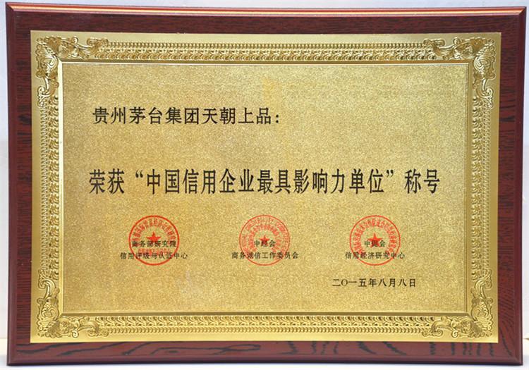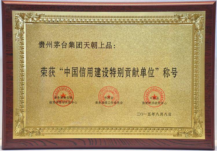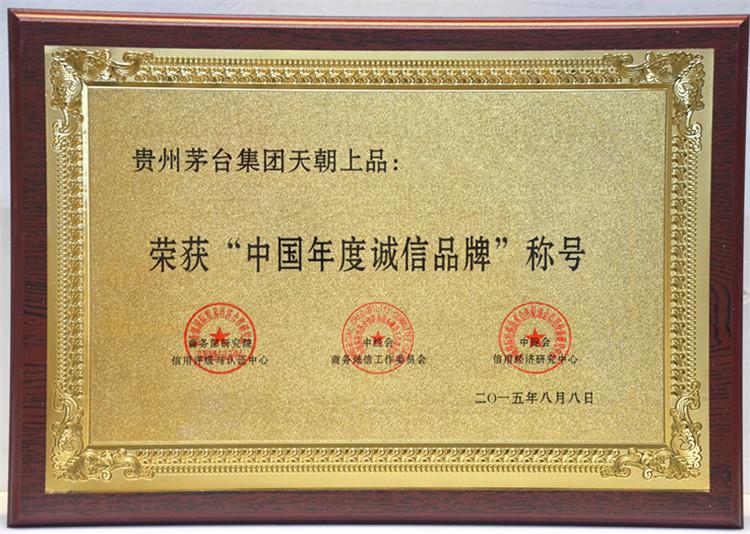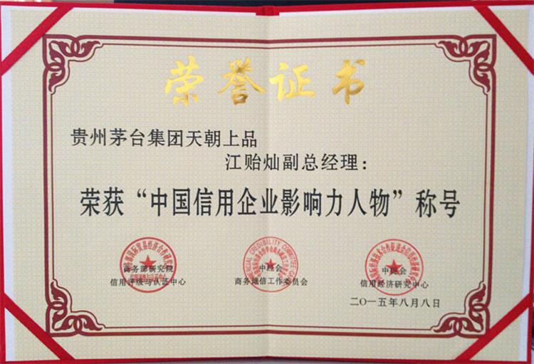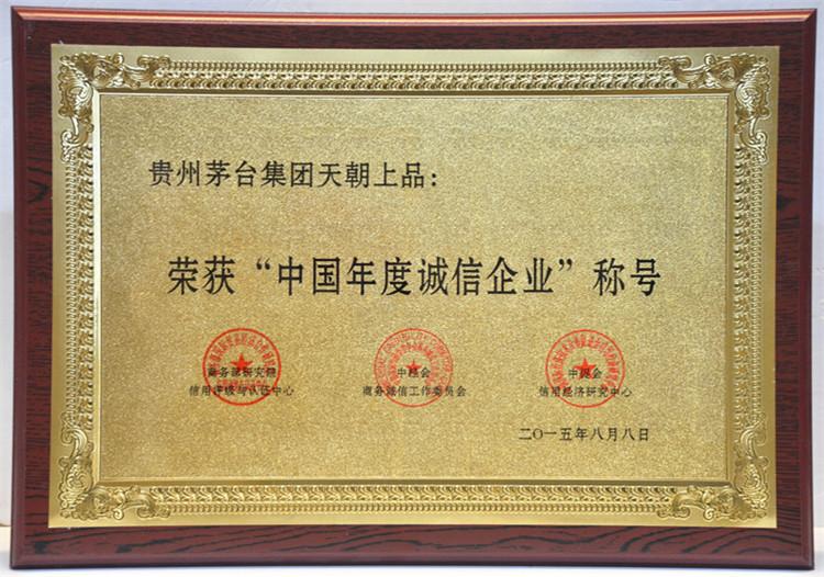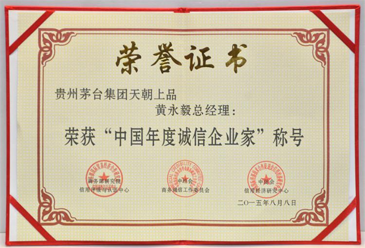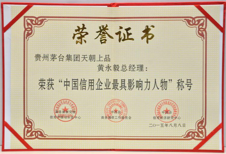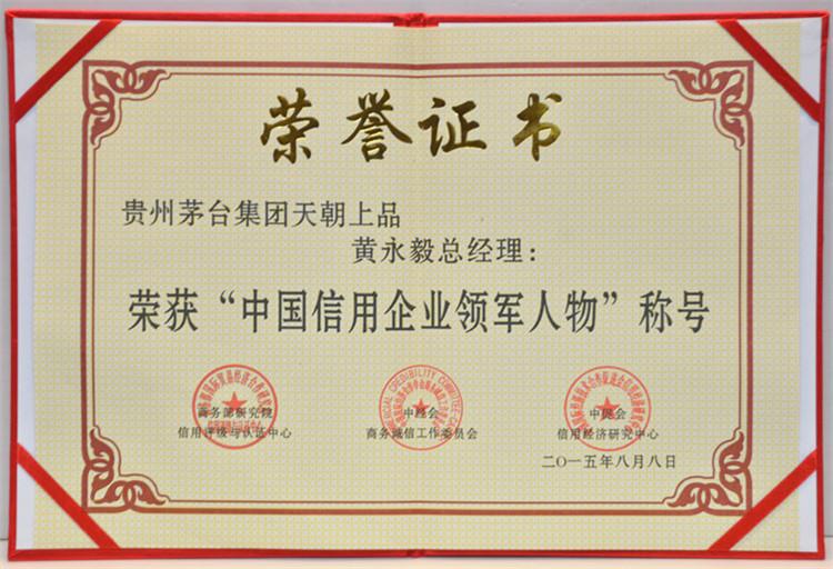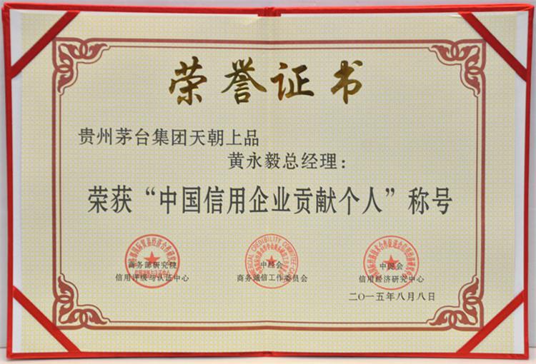 2015年8月15日,在釣魚臺國賓館舉行的第十二屆中國企業信用年會暨2015全國商務誠信建設經驗交流會上,天朝上品酒業再次獲得“中國年度誠信品牌”、“中國年度誠信企業”、“中國信用建設特別貢獻單位”、“ 中國信用企業最具影響力單位”殊榮。黃永毅總裁獲得“中國年度誠信企業家”、“中國信用企業領軍人物”、“中國信用企業最具影響力人物”、“中國信用企業貢獻個人”稱號,并與江貽燦副總裁分別獲得“中國信用企業影響力人物”稱號。